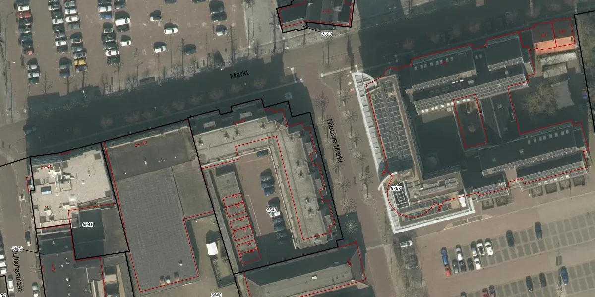 Het perceel waarop Markt 79 staat heeft een oppervlakte van 2082 m². Dit is een zeer groot perceel. De perceeloppervlakte wordt geregistreerd door het Kadaster. Gedetailleerde informatie over de maten van dit perceel kunt u vinden in het rapport Kadastrale kaart met maatvoering van Markt 79.