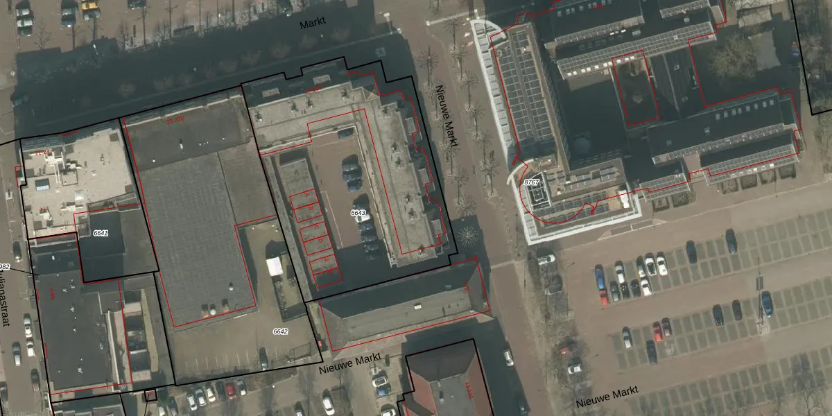 Het perceel waarop Markt 85 staat heeft een oppervlakte van 2082 m². Dit is een zeer groot perceel. De perceeloppervlakte wordt geregistreerd door het Kadaster. Gedetailleerde informatie over de maten van dit perceel kunt u vinden in het rapport Kadastrale kaart met maatvoering van Markt 85.