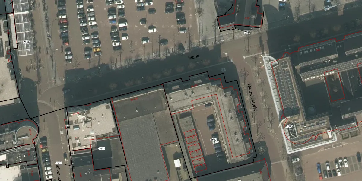 Het perceel waarop Markt 93 staat heeft een oppervlakte van 2082 m². Dit is een zeer groot perceel. De perceeloppervlakte wordt geregistreerd door het Kadaster. Gedetailleerde informatie over de maten van dit perceel kunt u vinden in het rapport Kadastrale kaart met maatvoering van Markt 93.