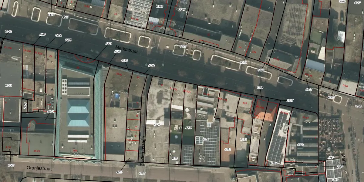 Het perceel waarop Marktstraat 37-A staat heeft een oppervlakte van 315 m². Dit is een groot perceel. De perceeloppervlakte wordt geregistreerd door het Kadaster. Gedetailleerde informatie over de maten van dit perceel kunt u vinden in het rapport Kadastrale kaart met maatvoering van Marktstraat 37-A.