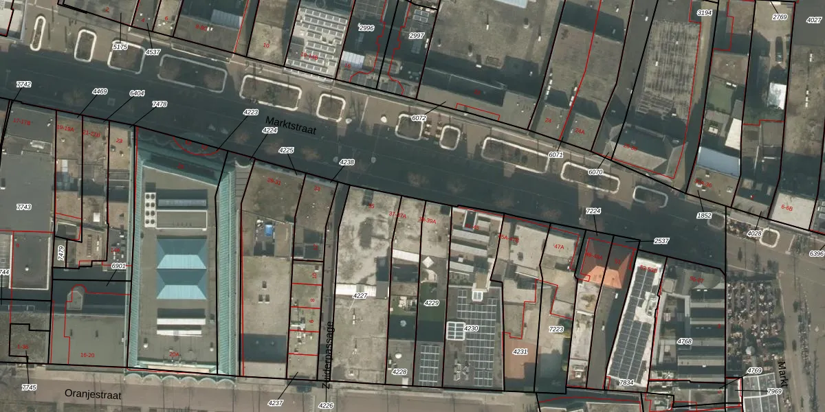 Het perceel waarop Marktstraat 37 staat heeft een oppervlakte van 315 m². Dit is een groot perceel. De perceeloppervlakte wordt geregistreerd door het Kadaster. Gedetailleerde informatie over de maten van dit perceel kunt u vinden in het rapport Kadastrale kaart met maatvoering van Marktstraat 37.