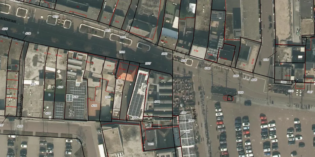 Het perceel waarop Marktstraat 63 staat heeft een oppervlakte van 493 m². Dit is een groot perceel. De perceeloppervlakte wordt geregistreerd door het Kadaster. Gedetailleerde informatie over de maten van dit perceel kunt u vinden in het rapport Kadastrale kaart met maatvoering van Marktstraat 63.