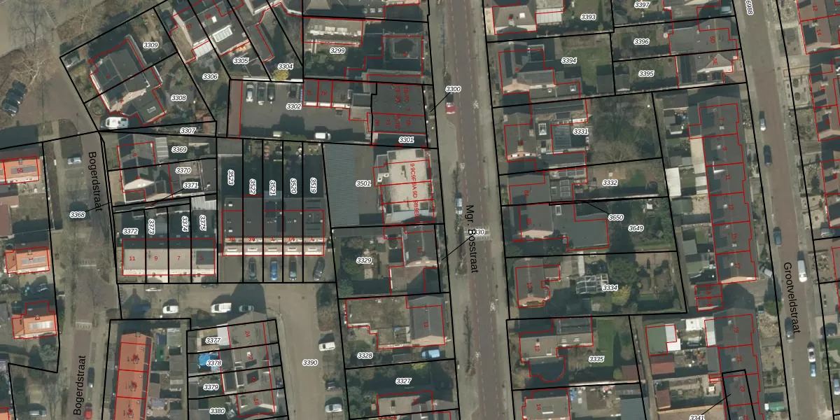 Het perceel waarop Mgr. Bosstraat 9-E staat heeft een oppervlakte van 521 m². Dit is een groot perceel. De perceeloppervlakte wordt geregistreerd door het Kadaster. Gedetailleerde informatie over de maten van dit perceel kunt u vinden in het rapport Kadastrale kaart met maatvoering van Mgr. Bosstraat 9-E.