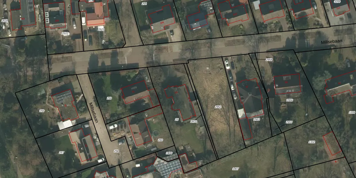 Het perceel waarop Millsebaan 53 staat heeft een oppervlakte van 1215 m². Dit is een zeer groot perceel. De perceeloppervlakte wordt geregistreerd door het Kadaster. Gedetailleerde informatie over de maten van dit perceel kunt u vinden in het rapport Kadastrale kaart met maatvoering van Millsebaan 53.