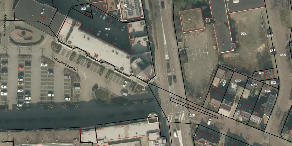Het perceel waarop Mondriaanplein 26 staat heeft een oppervlakte van 1986 m². Dit is een zeer groot perceel. De perceeloppervlakte wordt geregistreerd door het Kadaster. Gedetailleerde informatie over de maten van dit perceel kunt u vinden in het rapport Kadastrale kaart met maatvoering van Mondriaanplein 26.