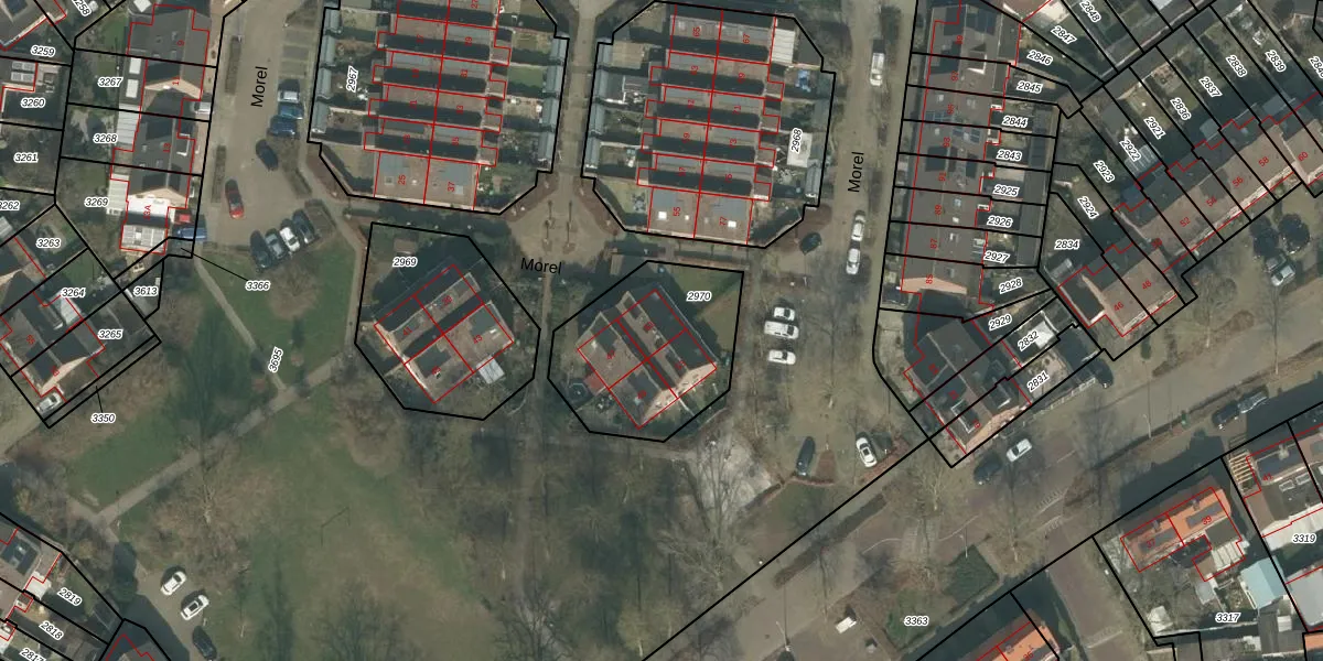 Het perceel waarop Morel 51 staat heeft een oppervlakte van 591 m². Dit is een groot perceel. De perceeloppervlakte wordt geregistreerd door het Kadaster. Gedetailleerde informatie over de maten van dit perceel kunt u vinden in het rapport Kadastrale kaart met maatvoering van Morel 51.