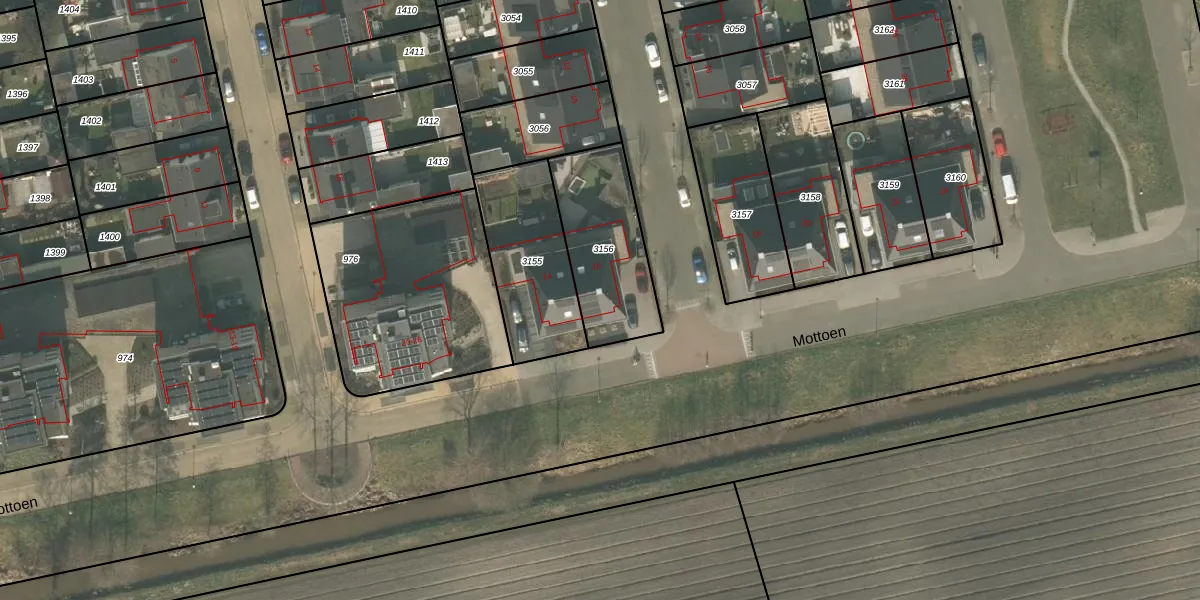 Het perceel waarop Mottoen 16 staat heeft een oppervlakte van 413 m². Dit is een groot perceel. De perceeloppervlakte wordt geregistreerd door het Kadaster. Gedetailleerde informatie over de maten van dit perceel kunt u vinden in het rapport Kadastrale kaart met maatvoering van Mottoen 16.