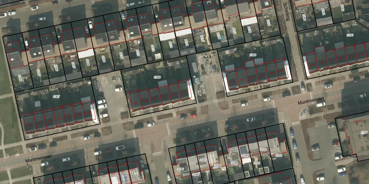 Het perceel waarop Muntmeester 174 staat heeft een oppervlakte van 965 m². Dit is een groot perceel. De perceeloppervlakte wordt geregistreerd door het Kadaster. Gedetailleerde informatie over de maten van dit perceel kunt u vinden in het rapport Kadastrale kaart met maatvoering van Muntmeester 174.