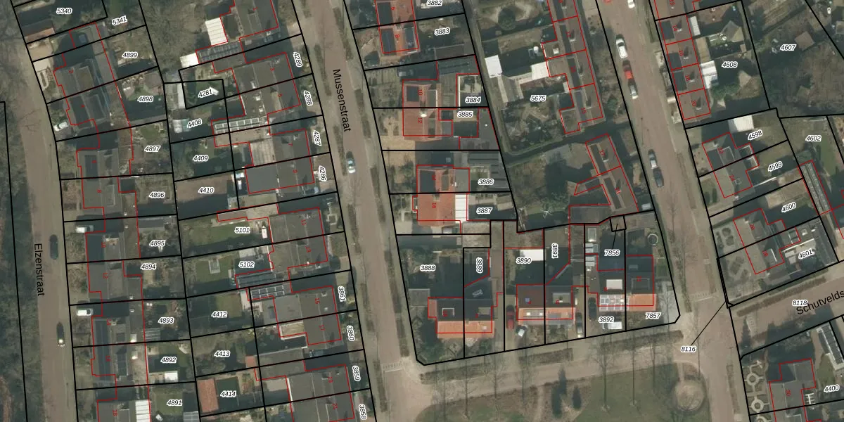 Mussenstraat 16 is gelegen op kadastraal perceel UDN00M3887. Deze kadastrale aanduiding is uniek en wordt gebruikt door het Kadaster om eigendomsrechten en andere zakelijke rechten vast te leggen. Het perceel maakt onderdeel uit van de kadastrale gemeente Uden.