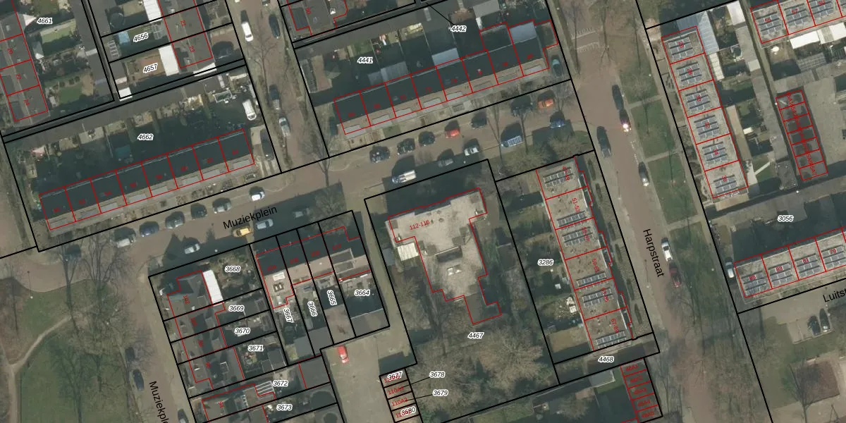 Muziekplein 112 is gelegen op kadastraal perceel UDN00B4467. Deze kadastrale aanduiding is uniek en wordt gebruikt door het Kadaster om eigendomsrechten en andere zakelijke rechten vast te leggen. Het perceel maakt onderdeel uit van de kadastrale gemeente Uden.