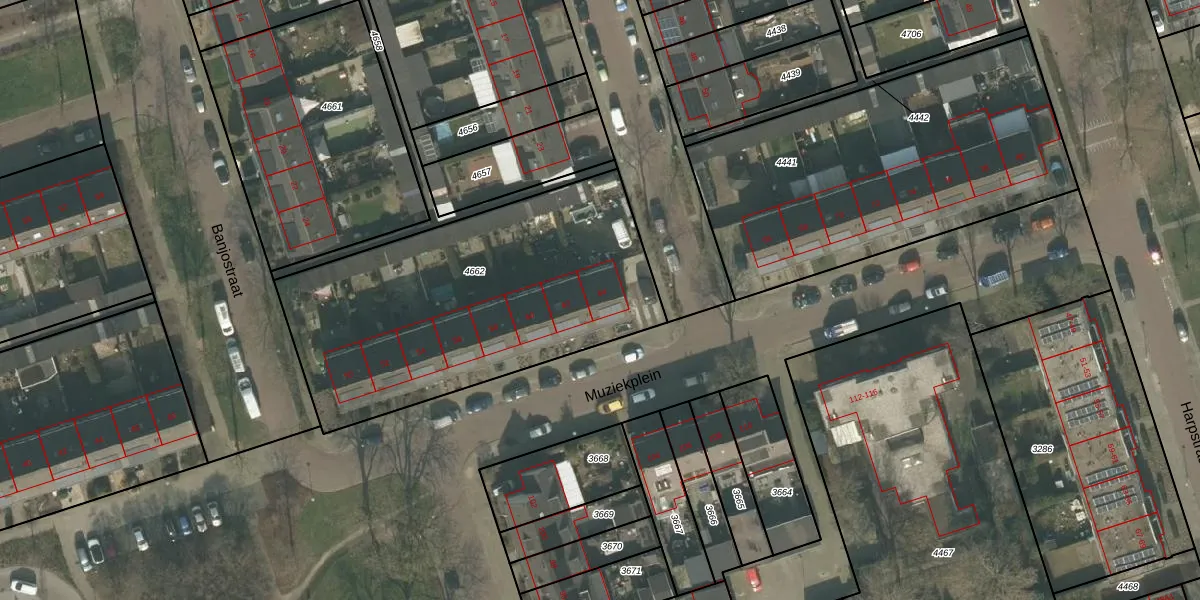 Het perceel waarop Muziekplein 64 staat heeft een oppervlakte van 1625 m². Dit is een zeer groot perceel. De perceeloppervlakte wordt geregistreerd door het Kadaster. Gedetailleerde informatie over de maten van dit perceel kunt u vinden in het rapport Kadastrale kaart met maatvoering van Muziekplein 64.