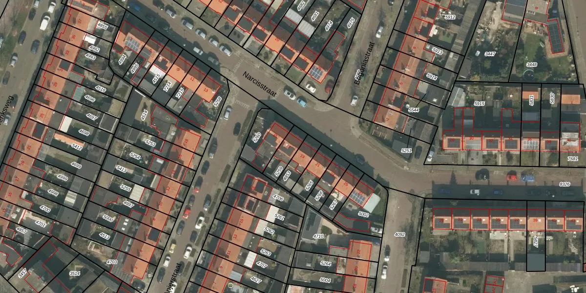 Het perceel waarop Narcisstraat 17 staat heeft een oppervlakte van 114 m². Dit is een middelgroot perceel. De perceeloppervlakte wordt geregistreerd door het Kadaster. Gedetailleerde informatie over de maten van dit perceel kunt u vinden in het rapport Kadastrale kaart met maatvoering van Narcisstraat 17.