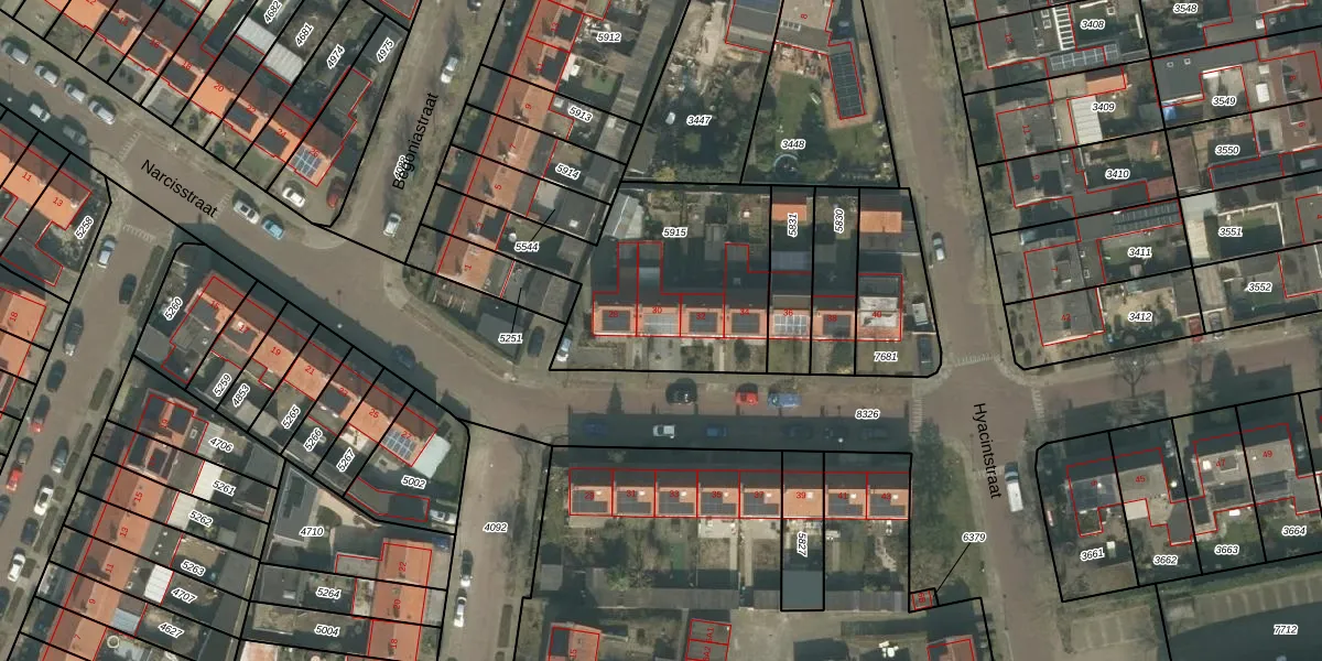 Het perceel waarop Narcisstraat 30 staat heeft een oppervlakte van 957 m². Dit is een groot perceel. De perceeloppervlakte wordt geregistreerd door het Kadaster. Gedetailleerde informatie over de maten van dit perceel kunt u vinden in het rapport Kadastrale kaart met maatvoering van Narcisstraat 30.