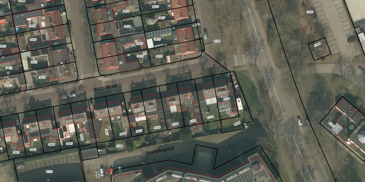 Narcisstraat 65 is gelegen op kadastraal perceel UDN00M6191. Deze kadastrale aanduiding is uniek en wordt gebruikt door het Kadaster om eigendomsrechten en andere zakelijke rechten vast te leggen. Het perceel maakt onderdeel uit van de kadastrale gemeente Uden.