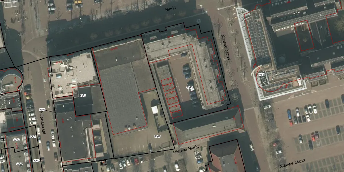 Het perceel waarop Nieuwe Markt 1-B staat heeft een oppervlakte van 2082 m². Dit is een zeer groot perceel. De perceeloppervlakte wordt geregistreerd door het Kadaster. Gedetailleerde informatie over de maten van dit perceel kunt u vinden in het rapport Kadastrale kaart met maatvoering van Nieuwe Markt 1-B.