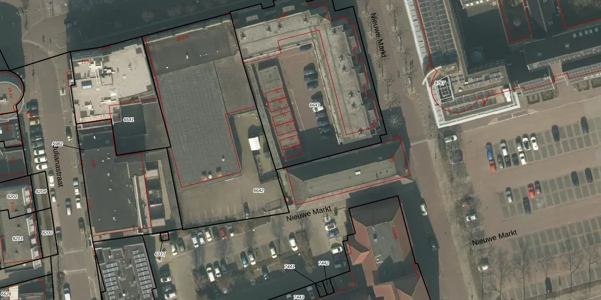 Het perceel waarop Nieuwe Markt 1-F staat heeft een oppervlakte van 2082 m². Dit is een zeer groot perceel. De perceeloppervlakte wordt geregistreerd door het Kadaster. Gedetailleerde informatie over de maten van dit perceel kunt u vinden in het rapport Kadastrale kaart met maatvoering van Nieuwe Markt 1-F.
