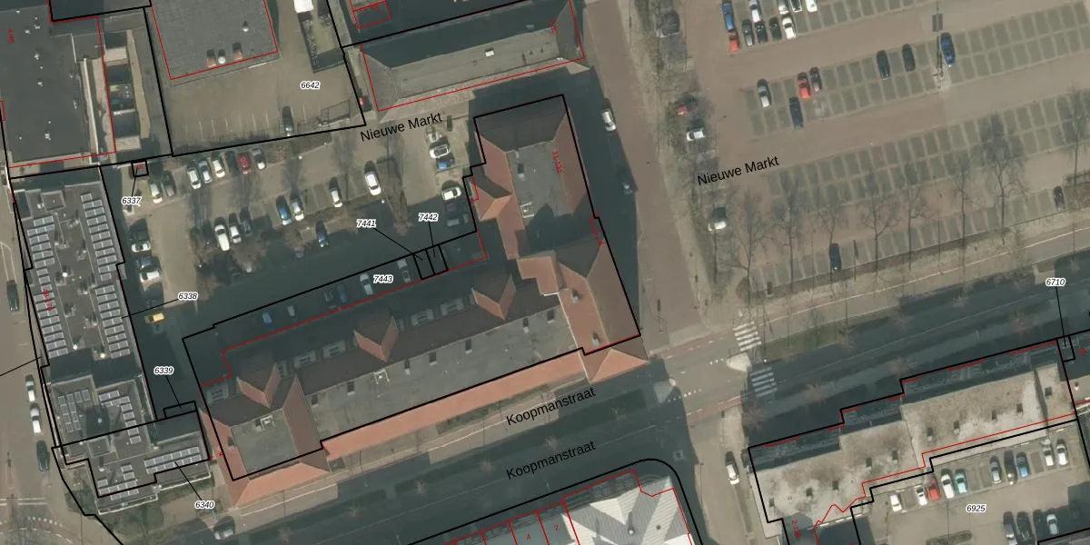 Het perceel waarop Nieuwe Markt 103 staat heeft een oppervlakte van 2504 m². Dit is een zeer groot perceel. De perceeloppervlakte wordt geregistreerd door het Kadaster. Gedetailleerde informatie over de maten van dit perceel kunt u vinden in het rapport Kadastrale kaart met maatvoering van Nieuwe Markt 103.