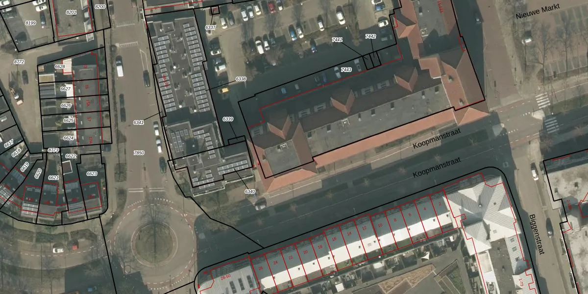 Het perceel waarop Nieuwe Markt 117 staat heeft een oppervlakte van 2504 m². Dit is een zeer groot perceel. De perceeloppervlakte wordt geregistreerd door het Kadaster. Gedetailleerde informatie over de maten van dit perceel kunt u vinden in het rapport Kadastrale kaart met maatvoering van Nieuwe Markt 117.
