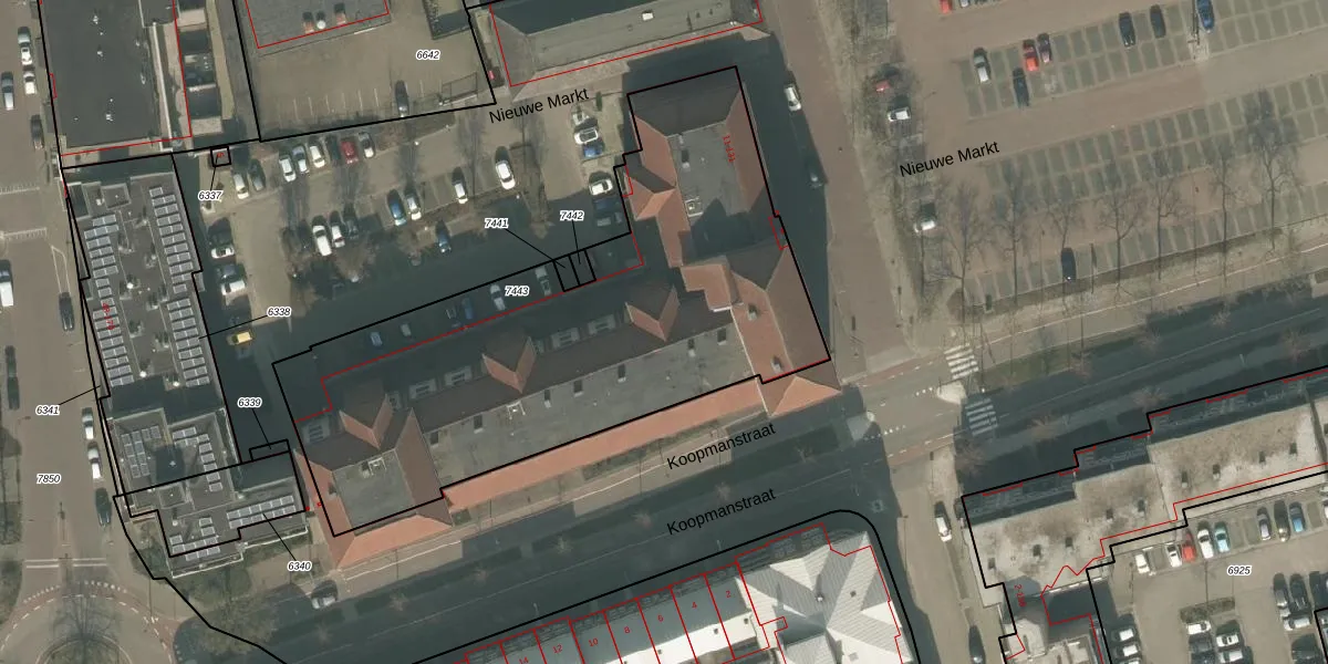 Het perceel waarop Nieuwe Markt 21 staat heeft een oppervlakte van 2504 m². Dit is een zeer groot perceel. De perceeloppervlakte wordt geregistreerd door het Kadaster. Gedetailleerde informatie over de maten van dit perceel kunt u vinden in het rapport Kadastrale kaart met maatvoering van Nieuwe Markt 21.