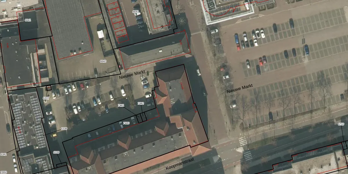 Het perceel waarop Nieuwe Markt 39 staat heeft een oppervlakte van 2504 m². Dit is een zeer groot perceel. De perceeloppervlakte wordt geregistreerd door het Kadaster. Gedetailleerde informatie over de maten van dit perceel kunt u vinden in het rapport Kadastrale kaart met maatvoering van Nieuwe Markt 39.