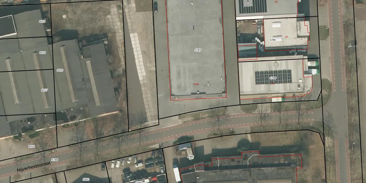 Het perceel waarop Nijverheidsstraat 44 staat heeft een oppervlakte van 3204 m². Dit is een zeer groot perceel. De perceeloppervlakte wordt geregistreerd door het Kadaster. Gedetailleerde informatie over de maten van dit perceel kunt u vinden in het rapport Kadastrale kaart met maatvoering van Nijverheidsstraat 44.