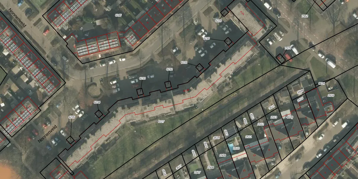 Het perceel waarop Nonnenveld 54 staat heeft een oppervlakte van 3719 m². Dit is een zeer groot perceel. De perceeloppervlakte wordt geregistreerd door het Kadaster. Gedetailleerde informatie over de maten van dit perceel kunt u vinden in het rapport Kadastrale kaart met maatvoering van Nonnenveld 54.