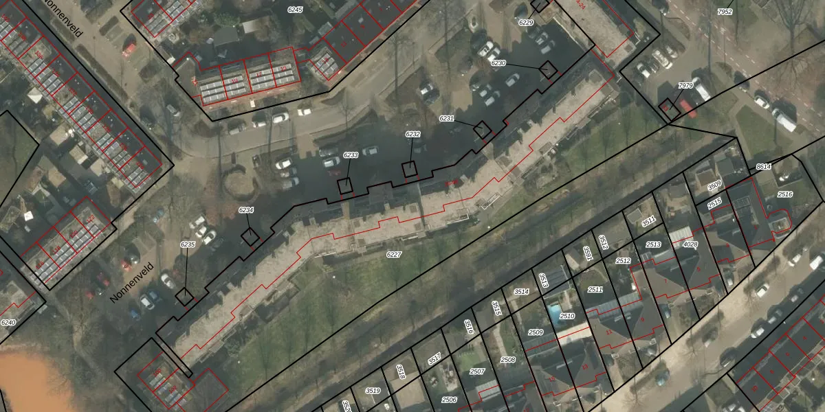 Het perceel waarop Nonnenveld 70 staat heeft een oppervlakte van 3719 m². Dit is een zeer groot perceel. De perceeloppervlakte wordt geregistreerd door het Kadaster. Gedetailleerde informatie over de maten van dit perceel kunt u vinden in het rapport Kadastrale kaart met maatvoering van Nonnenveld 70.