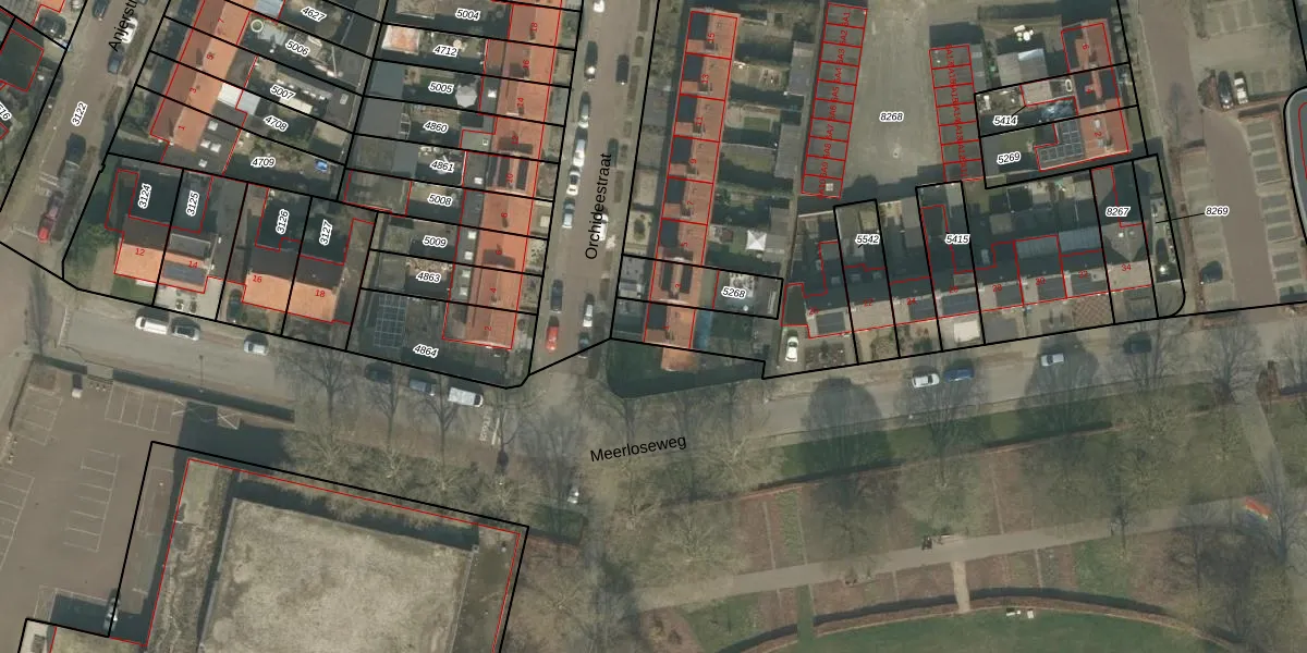 Het perceel waarop Orchideestraat 1 staat heeft een oppervlakte van 4369 m². Dit is een zeer groot perceel. De perceeloppervlakte wordt geregistreerd door het Kadaster. Gedetailleerde informatie over de maten van dit perceel kunt u vinden in het rapport Kadastrale kaart met maatvoering van Orchideestraat 1.
