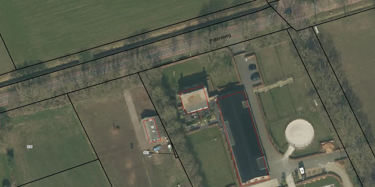 Het perceel waarop Patersweg 13 staat heeft een oppervlakte van 1,1 ha. Dit is een zeer groot perceel. De perceeloppervlakte wordt geregistreerd door het Kadaster. Gedetailleerde informatie over de maten van dit perceel kunt u vinden in het rapport Kadastrale kaart met maatvoering van Patersweg 13.