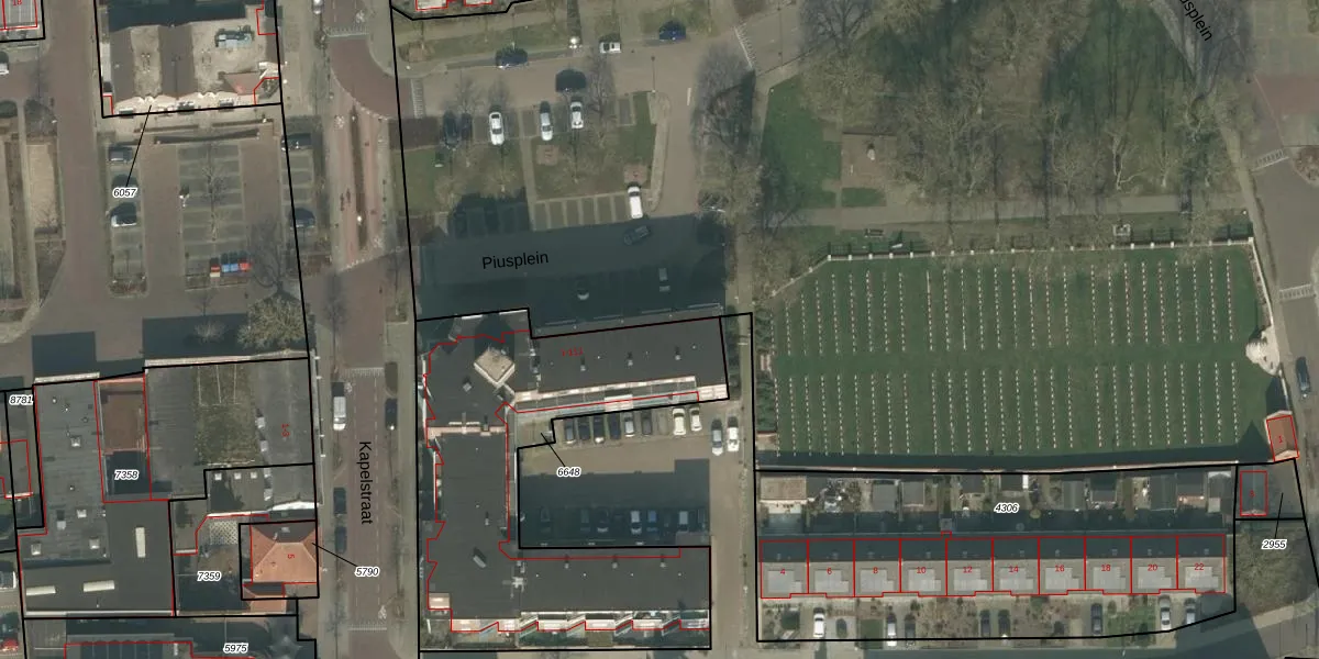 Het perceel waarop Piusplein 11 staat heeft een oppervlakte van 1655 m². Dit is een zeer groot perceel. De perceeloppervlakte wordt geregistreerd door het Kadaster. Gedetailleerde informatie over de maten van dit perceel kunt u vinden in het rapport Kadastrale kaart met maatvoering van Piusplein 11.