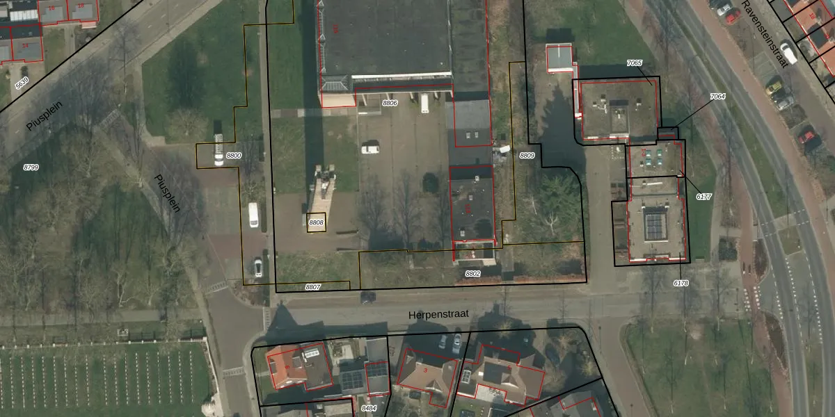 Het perceel waarop Piusplein 155 staat heeft een oppervlakte van 4264 m². Dit is een zeer groot perceel. De perceeloppervlakte wordt geregistreerd door het Kadaster. Gedetailleerde informatie over de maten van dit perceel kunt u vinden in het rapport Kadastrale kaart met maatvoering van Piusplein 155.