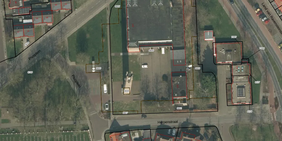 Het perceel waarop Piusplein 201 staat heeft een oppervlakte van 4264 m². Dit is een zeer groot perceel. De perceeloppervlakte wordt geregistreerd door het Kadaster. Gedetailleerde informatie over de maten van dit perceel kunt u vinden in het rapport Kadastrale kaart met maatvoering van Piusplein 201.