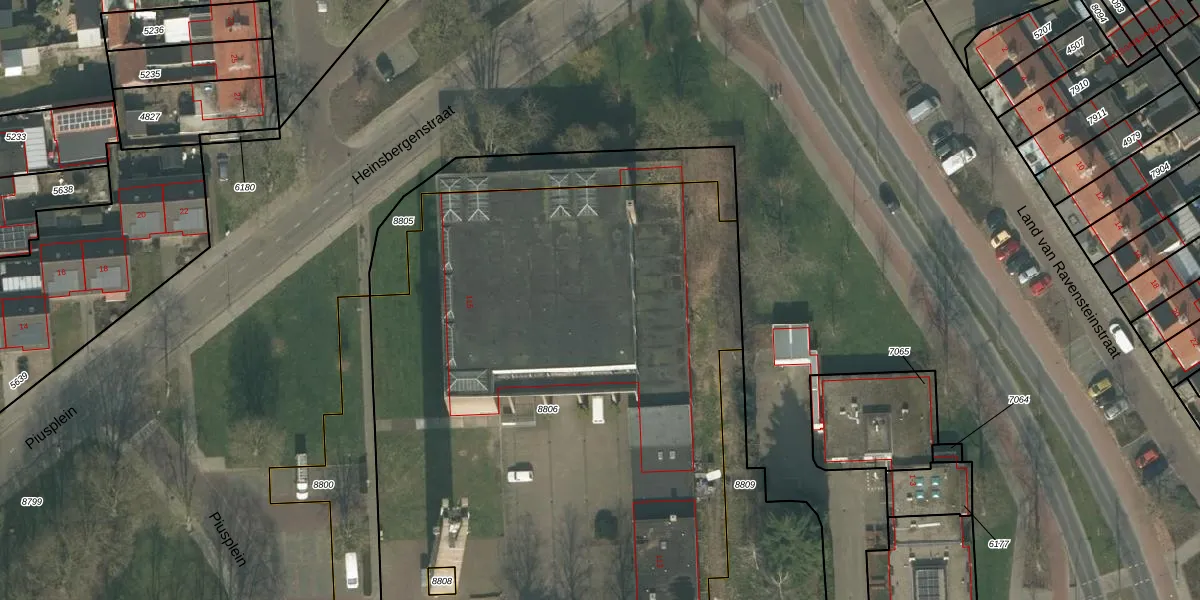Het perceel waarop Piusplein 215 staat heeft een oppervlakte van 4264 m². Dit is een zeer groot perceel. De perceeloppervlakte wordt geregistreerd door het Kadaster. Gedetailleerde informatie over de maten van dit perceel kunt u vinden in het rapport Kadastrale kaart met maatvoering van Piusplein 215.