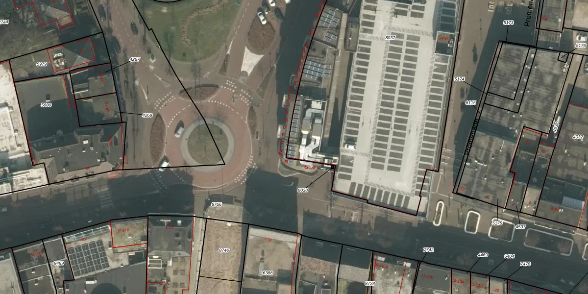 Het perceel waarop Promenade 54 staat heeft een oppervlakte van 4242 m². Dit is een zeer groot perceel. De perceeloppervlakte wordt geregistreerd door het Kadaster. Gedetailleerde informatie over de maten van dit perceel kunt u vinden in het rapport Kadastrale kaart met maatvoering van Promenade 54.