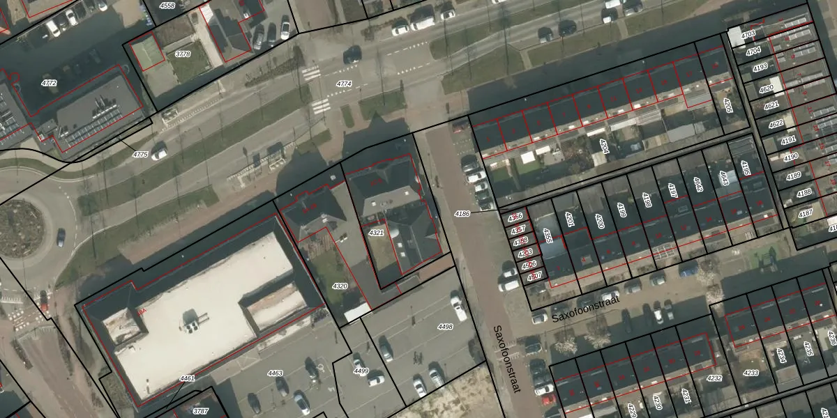 Saxofoonstraat 1 is gelegen op kadastraal perceel UDN00B4321. Deze kadastrale aanduiding is uniek en wordt gebruikt door het Kadaster om eigendomsrechten en andere zakelijke rechten vast te leggen. Het perceel maakt onderdeel uit van de kadastrale gemeente Uden.