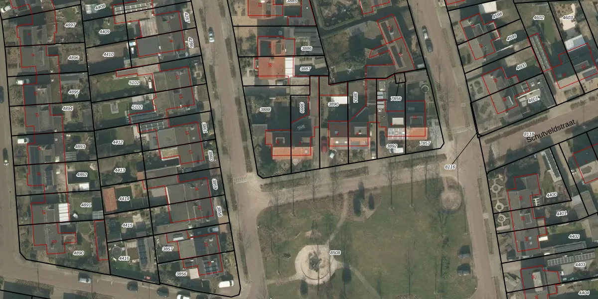 Schutveldstraat 2 is gelegen op kadastraal perceel UDN00M3889. Deze kadastrale aanduiding is uniek en wordt gebruikt door het Kadaster om eigendomsrechten en andere zakelijke rechten vast te leggen. Het perceel maakt onderdeel uit van de kadastrale gemeente Uden.
