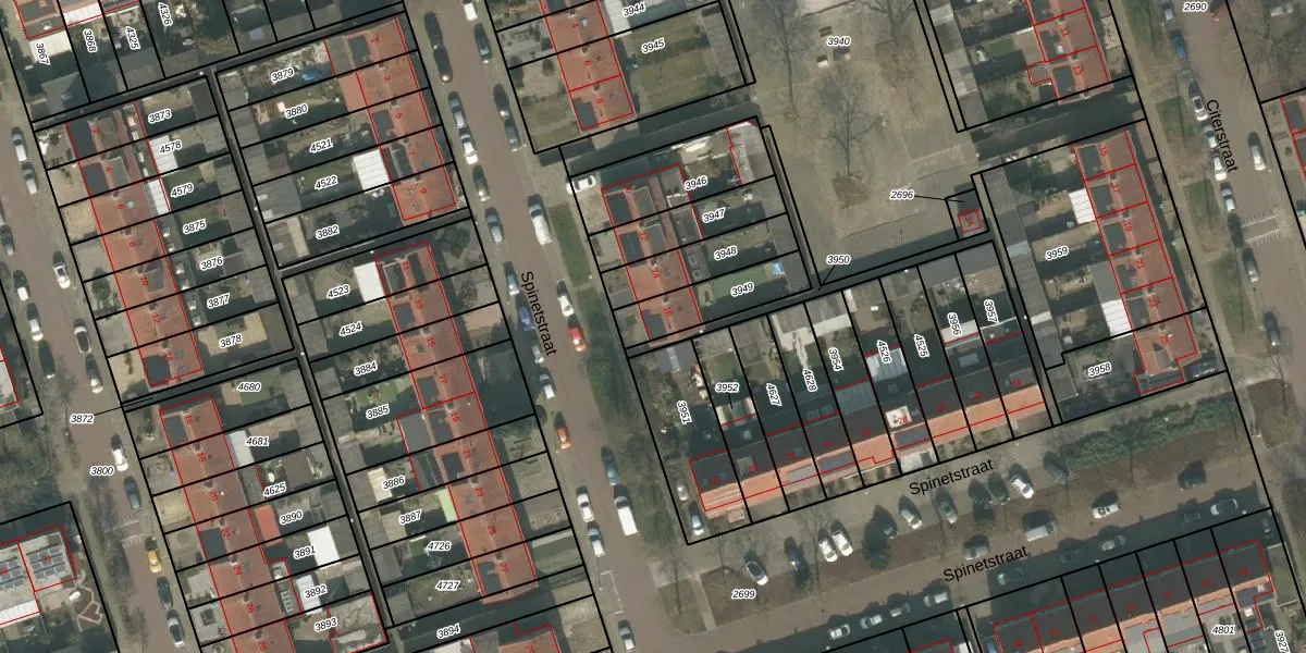 Spinetstraat 16 is gelegen op kadastraal perceel UDN00B3949. Deze kadastrale aanduiding is uniek en wordt gebruikt door het Kadaster om eigendomsrechten en andere zakelijke rechten vast te leggen. Het perceel maakt onderdeel uit van de kadastrale gemeente Uden.