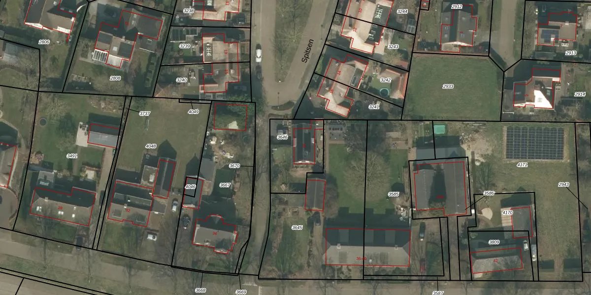 Het perceel waarop Spitsen 18 staat heeft een oppervlakte van 415 m². Dit is een groot perceel. De perceeloppervlakte wordt geregistreerd door het Kadaster. Gedetailleerde informatie over de maten van dit perceel kunt u vinden in het rapport Kadastrale kaart met maatvoering van Spitsen 18.