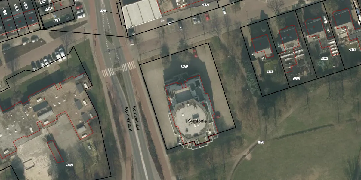 Het perceel waarop Symfonie 1 staat heeft een oppervlakte van 2003 m². Dit is een zeer groot perceel. De perceeloppervlakte wordt geregistreerd door het Kadaster. Gedetailleerde informatie over de maten van dit perceel kunt u vinden in het rapport Kadastrale kaart met maatvoering van Symfonie 1.