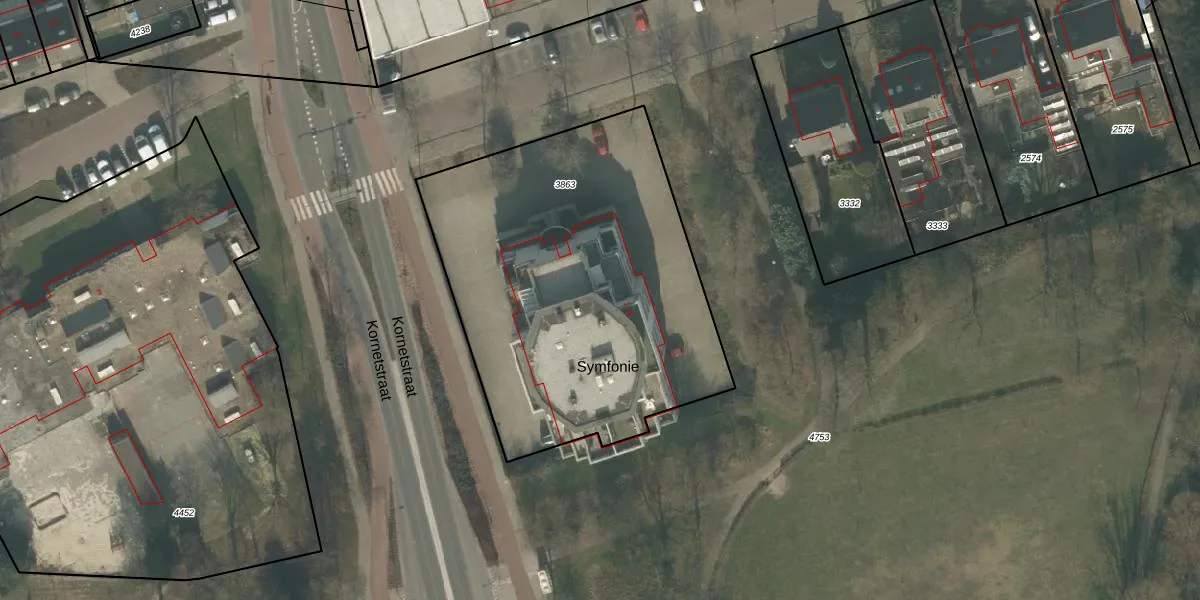 Het perceel waarop Symfonie 4 staat heeft een oppervlakte van 2003 m². Dit is een zeer groot perceel. De perceeloppervlakte wordt geregistreerd door het Kadaster. Gedetailleerde informatie over de maten van dit perceel kunt u vinden in het rapport Kadastrale kaart met maatvoering van Symfonie 4.