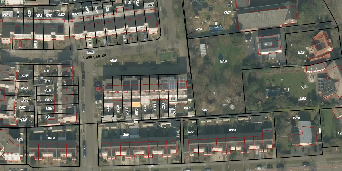 Veilingstraat 106 is gelegen op kadastraal perceel UDN00I3400. Deze kadastrale aanduiding is uniek en wordt gebruikt door het Kadaster om eigendomsrechten en andere zakelijke rechten vast te leggen. Het perceel maakt onderdeel uit van de kadastrale gemeente Uden.
