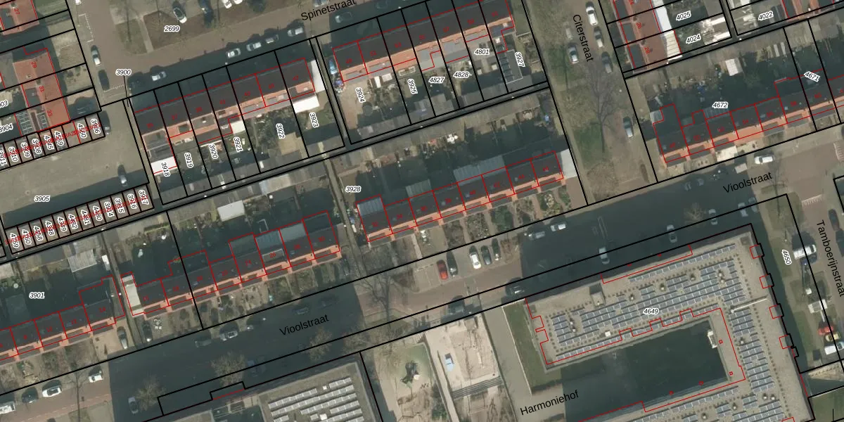 Het perceel waarop Vioolstraat 36 staat heeft een oppervlakte van 2833 m². Dit is een zeer groot perceel. De perceeloppervlakte wordt geregistreerd door het Kadaster. Gedetailleerde informatie over de maten van dit perceel kunt u vinden in het rapport Kadastrale kaart met maatvoering van Vioolstraat 36.