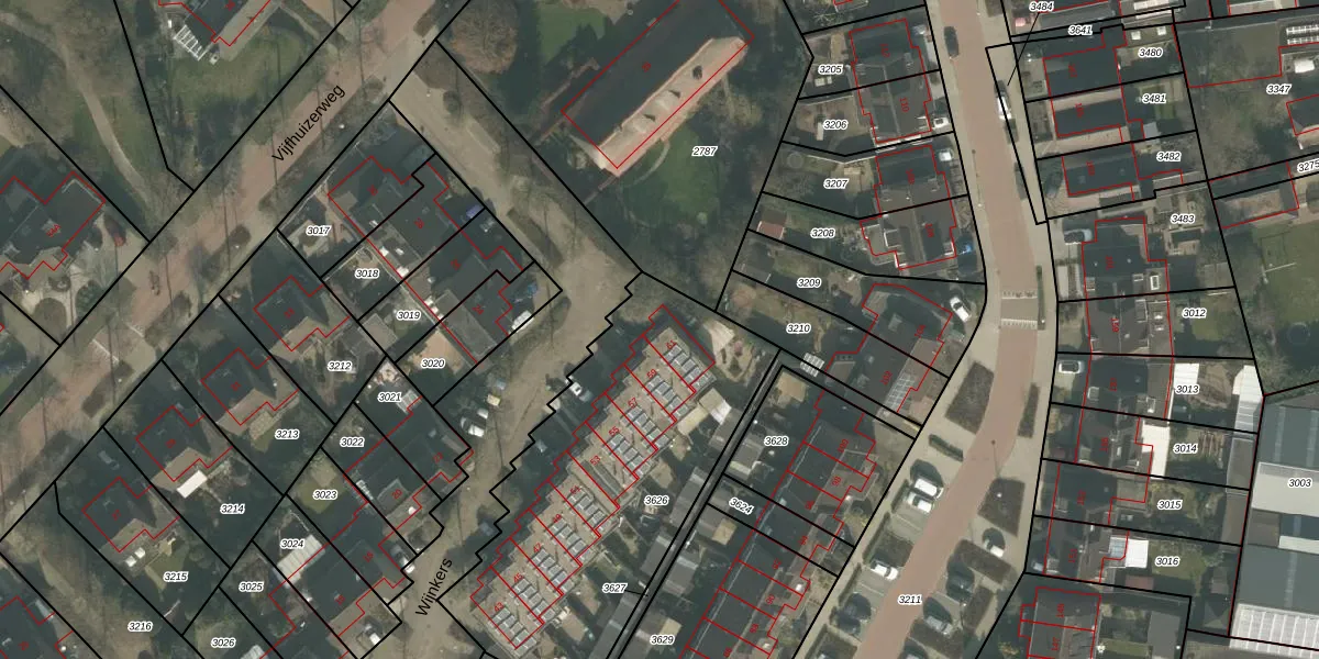 Het perceel waarop Wijnkers 61 staat heeft een oppervlakte van 1565 m². Dit is een zeer groot perceel. De perceeloppervlakte wordt geregistreerd door het Kadaster. Gedetailleerde informatie over de maten van dit perceel kunt u vinden in het rapport Kadastrale kaart met maatvoering van Wijnkers 61.