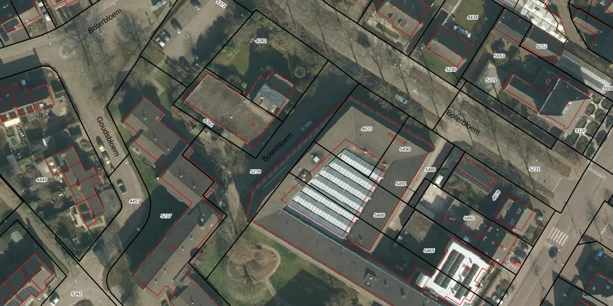 Boterbloem 1-115 is gelegen op kadastraal perceel UDH00F5466. Deze kadastrale aanduiding is uniek en wordt gebruikt door het Kadaster om eigendomsrechten en andere zakelijke rechten vast te leggen. Het perceel maakt onderdeel uit van de kadastrale gemeente Udenhout.