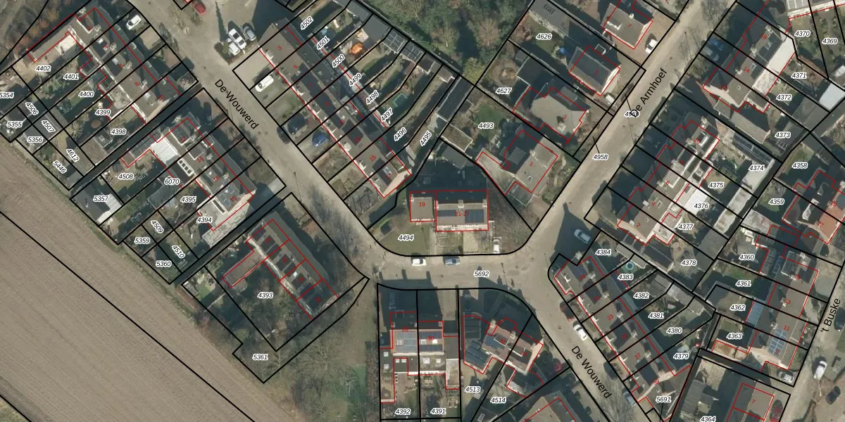 Het perceel waarop De Wouwerd 19 staat heeft een oppervlakte van 638 m². Dit is een groot perceel. De perceeloppervlakte wordt geregistreerd door het Kadaster. Gedetailleerde informatie over de maten van dit perceel kunt u vinden in het rapport Kadastrale kaart met maatvoering van De Wouwerd 19.