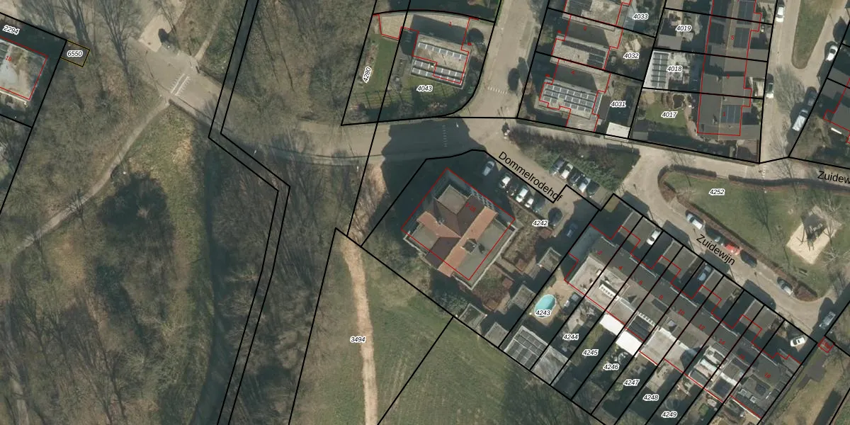 Dommelrodehof 9 is gelegen op kadastraal perceel UDH00E4242. Deze kadastrale aanduiding is uniek en wordt gebruikt door het Kadaster om eigendomsrechten en andere zakelijke rechten vast te leggen. Het perceel maakt onderdeel uit van de kadastrale gemeente Udenhout.