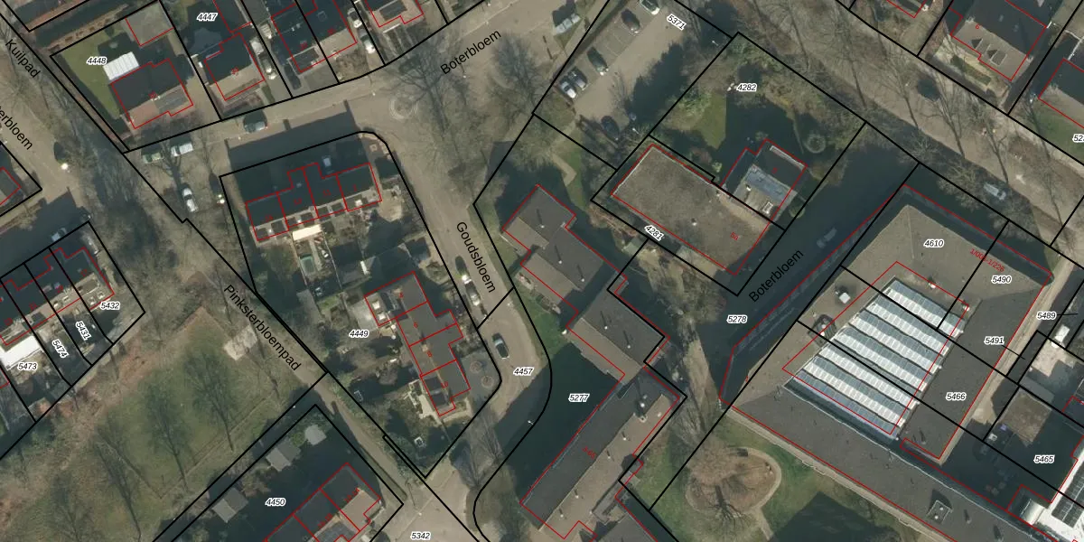 Het perceel waarop Goudsbloem 5 staat heeft een oppervlakte van 2565 m². Dit is een zeer groot perceel. De perceeloppervlakte wordt geregistreerd door het Kadaster. Gedetailleerde informatie over de maten van dit perceel kunt u vinden in het rapport Kadastrale kaart met maatvoering van Goudsbloem 5.