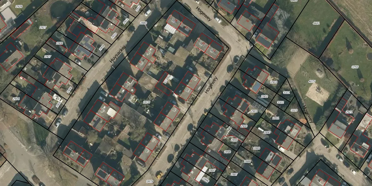 Het perceel waarop Hogewey 9 staat heeft een oppervlakte van 4510 m². Dit is een zeer groot perceel. De perceeloppervlakte wordt geregistreerd door het Kadaster. Gedetailleerde informatie over de maten van dit perceel kunt u vinden in het rapport Kadastrale kaart met maatvoering van Hogewey 9.