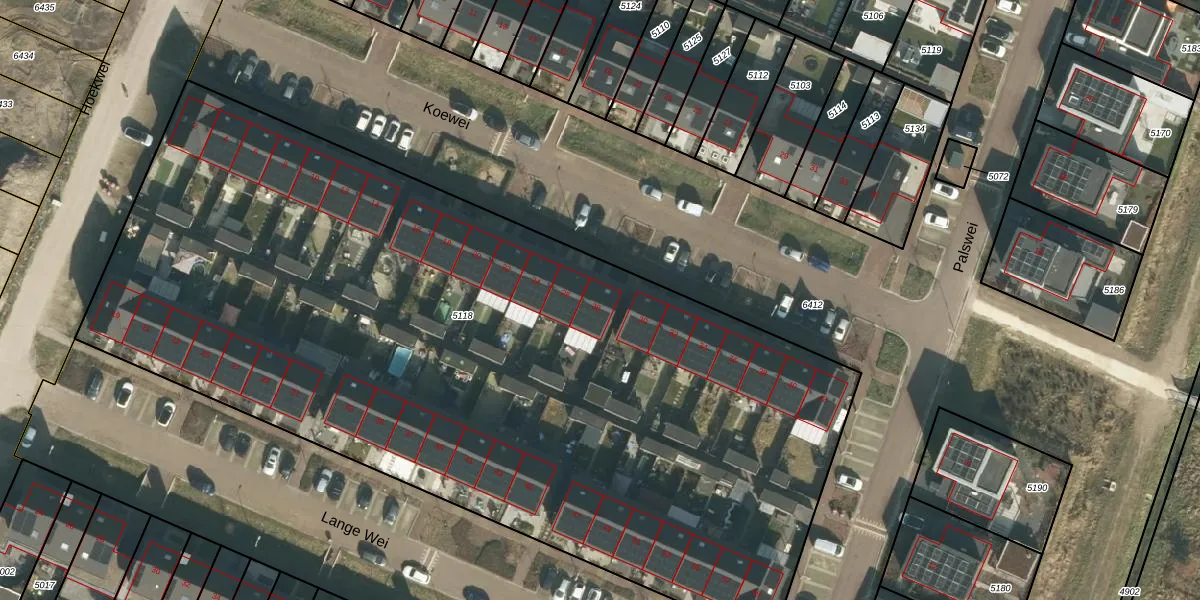 Het perceel waarop Koewei 28 staat heeft een oppervlakte van 5860 m². Dit is een zeer groot perceel. De perceeloppervlakte wordt geregistreerd door het Kadaster. Gedetailleerde informatie over de maten van dit perceel kunt u vinden in het rapport Kadastrale kaart met maatvoering van Koewei 28.