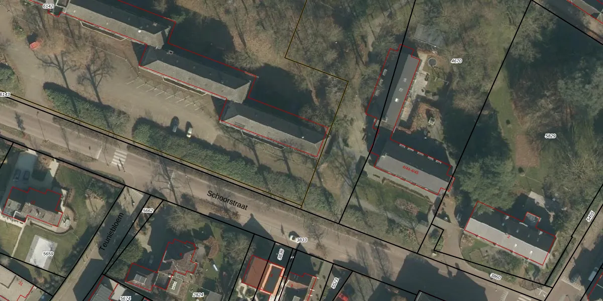 Het perceel waarop Schoorstraat 2-06 staat heeft een oppervlakte van 1,3 ha. Dit is een zeer groot perceel. De perceeloppervlakte wordt geregistreerd door het Kadaster. Gedetailleerde informatie over de maten van dit perceel kunt u vinden in het rapport Kadastrale kaart met maatvoering van Schoorstraat 2-06.